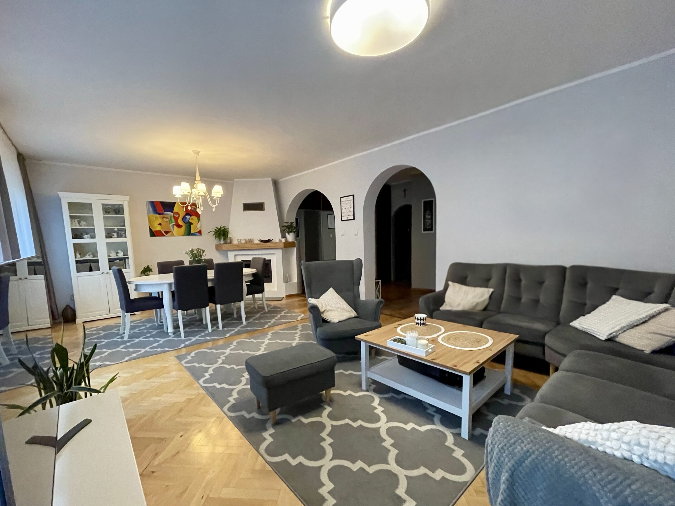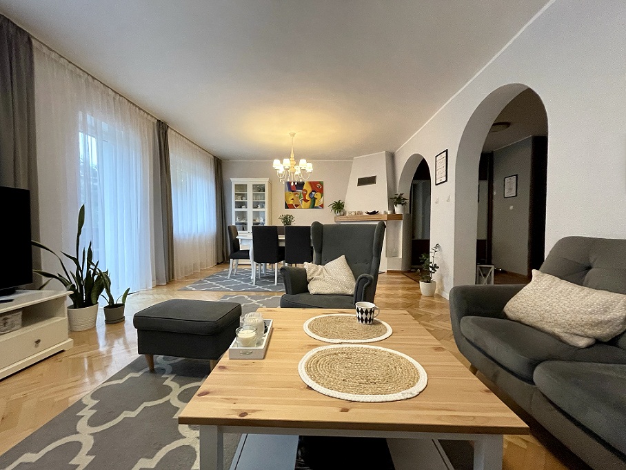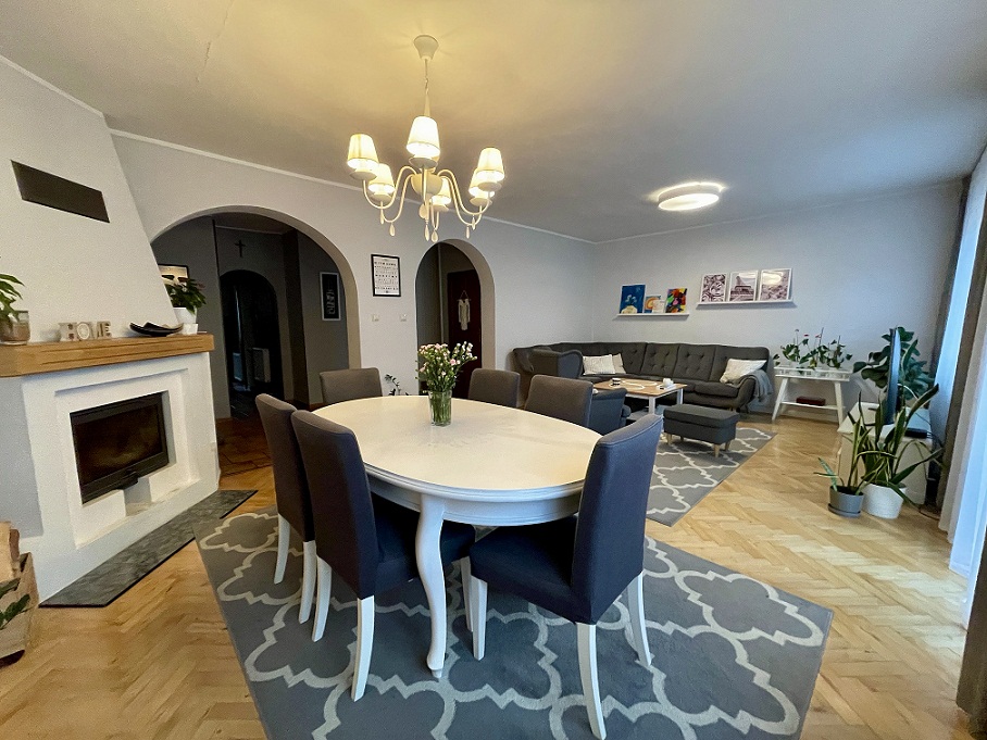 Dom o powierzchni użytkowej 170m2. plus dodatkowa powierzchnia nie wliczona w kw ok 75 m2 -zagospodarowana częściowo na strychu oraz poziomie minus jeden.