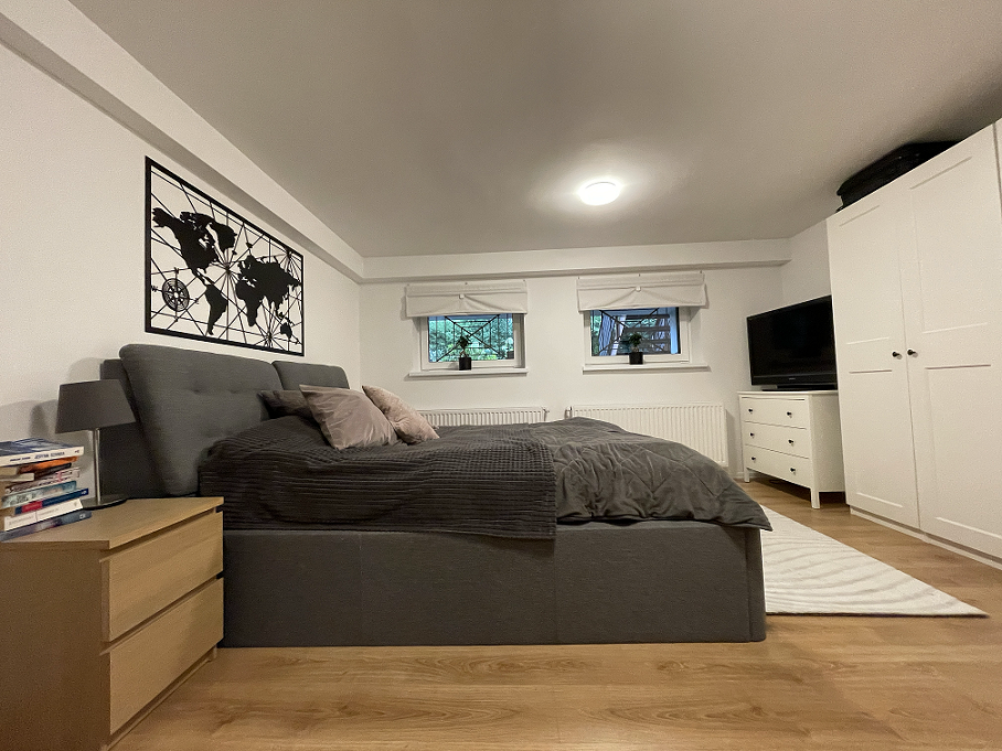 -Poziom minus 1: garaż , reszta powierzchni na ten moment obecni właściciele zaaranżowali na przestronną sypialnię 16m2, łazienkę z pralnią 10m2, dodatkowe pomieszczenie gospodarcze ok 10 m2 z wyjściem na ogród ( poziom minus jeden to idealna powierzchnia pod prowadzenie działalności gospodarczej )
