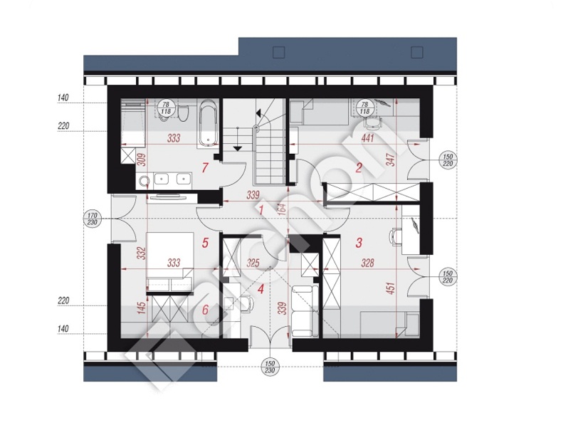 - PIĘTRO to część prywatna, 4 pokoje (11, 48 m2, 12,29 m2, 9,84  m2, 10,81 m2), łazienka 7,55 m2, hol i schody 11,64.